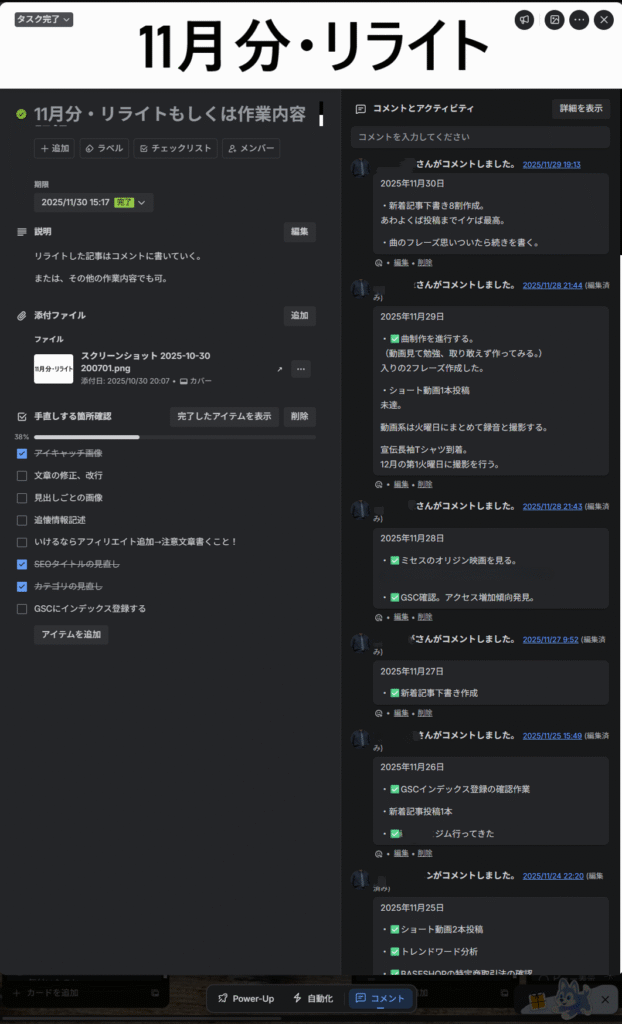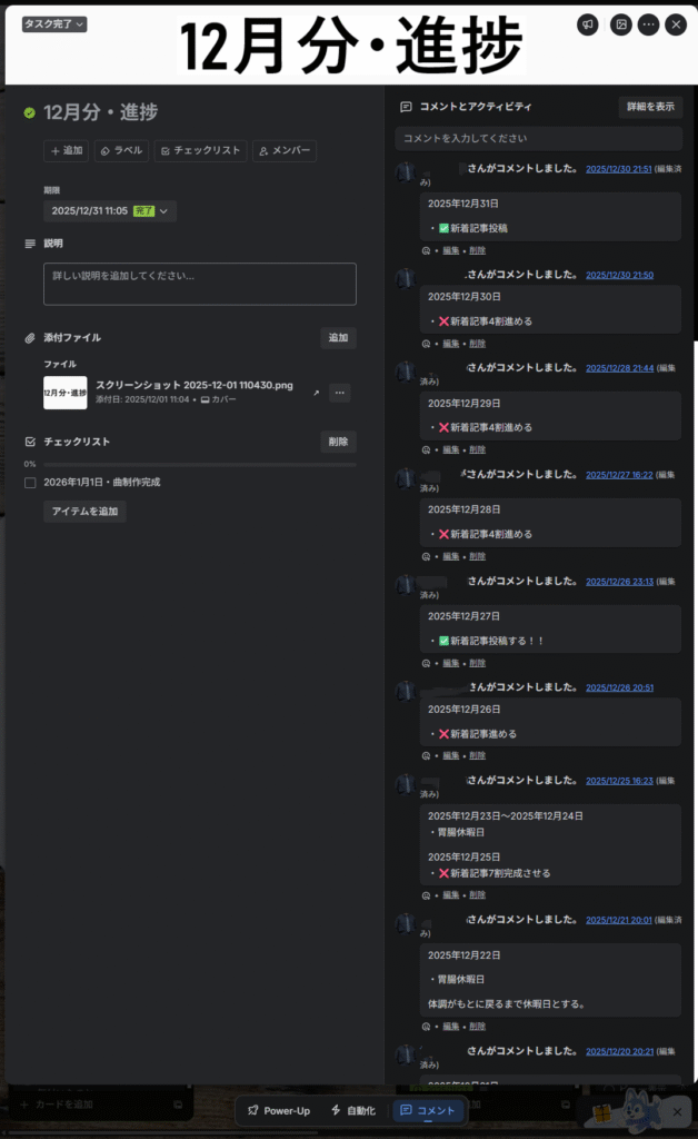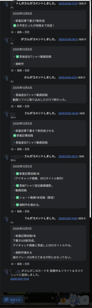 それから俺は、Trelloのコメントとアクティビティで